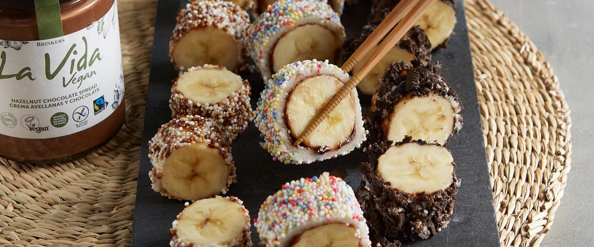 Cut up the Oreo cookies finely and put on a plate along with the rainbow sprinkles. Peel the bananas and cut off the ends. Halven the bananas and twist one halve so you get a more straight banana. Roll the fondant out thinly on a kitchen sink covered with powdered sugar, and smear with the La Vida Vegan hazelnut spread or La Vida Vegan coconut spread. Lay the banana on top of the fondant and roll up tightly. Smear the outside of the fondant with a little bit of the La Vida Vegan coconut spread so the decoration sticks. Roll through the Oreo cookies or rainbow sprinkles. Smear the other bananas with La Vida Vegan with La Vida Vegan hazelnut spread or coconut spread and also roll these through the Oreo crumbles or rainbow sprinkles. Repeat until you’re out of bananas and cut them in equally thick chunks, then serve on a platter with chopsticks. Enjoy!