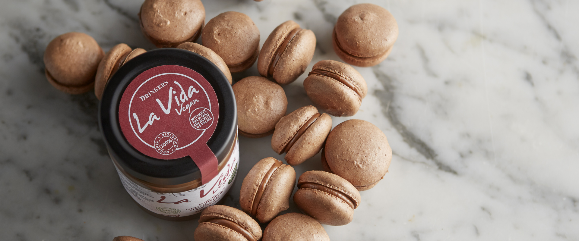 - Turn all macarons over and pipe the La Vida Vegan almond chocolate spread on half of the caps and cover with the other half of the caps.