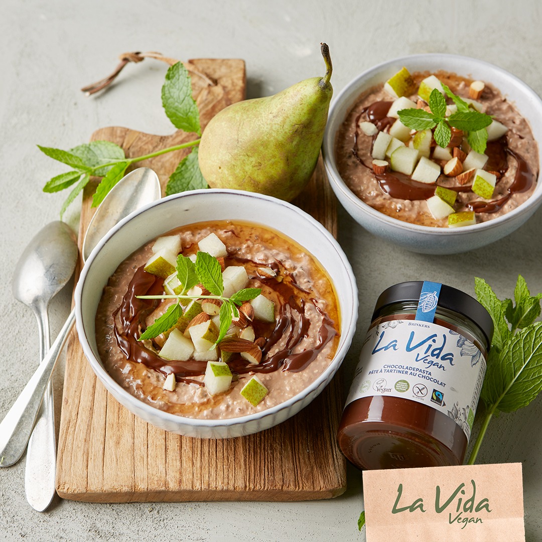 - Add your additional toppings just before serving. Add more pear, some nuts (walnut or almonds), add some more La Vida Vegan chocolate spread and add your vegan / no bee honey for sweetness.