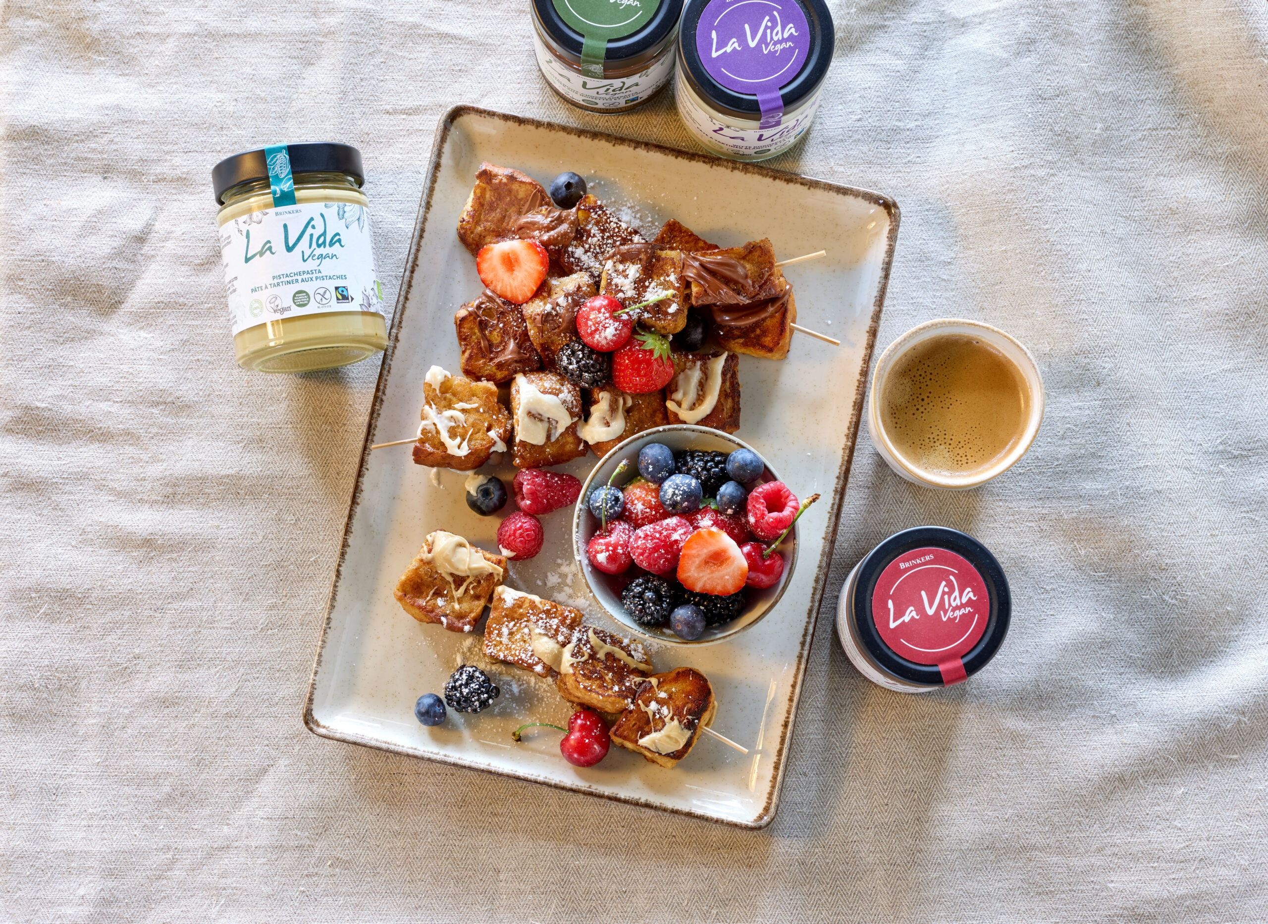 - Serve the French toast skewers warm, generously spread with La Vida Vegan chocolate spread.