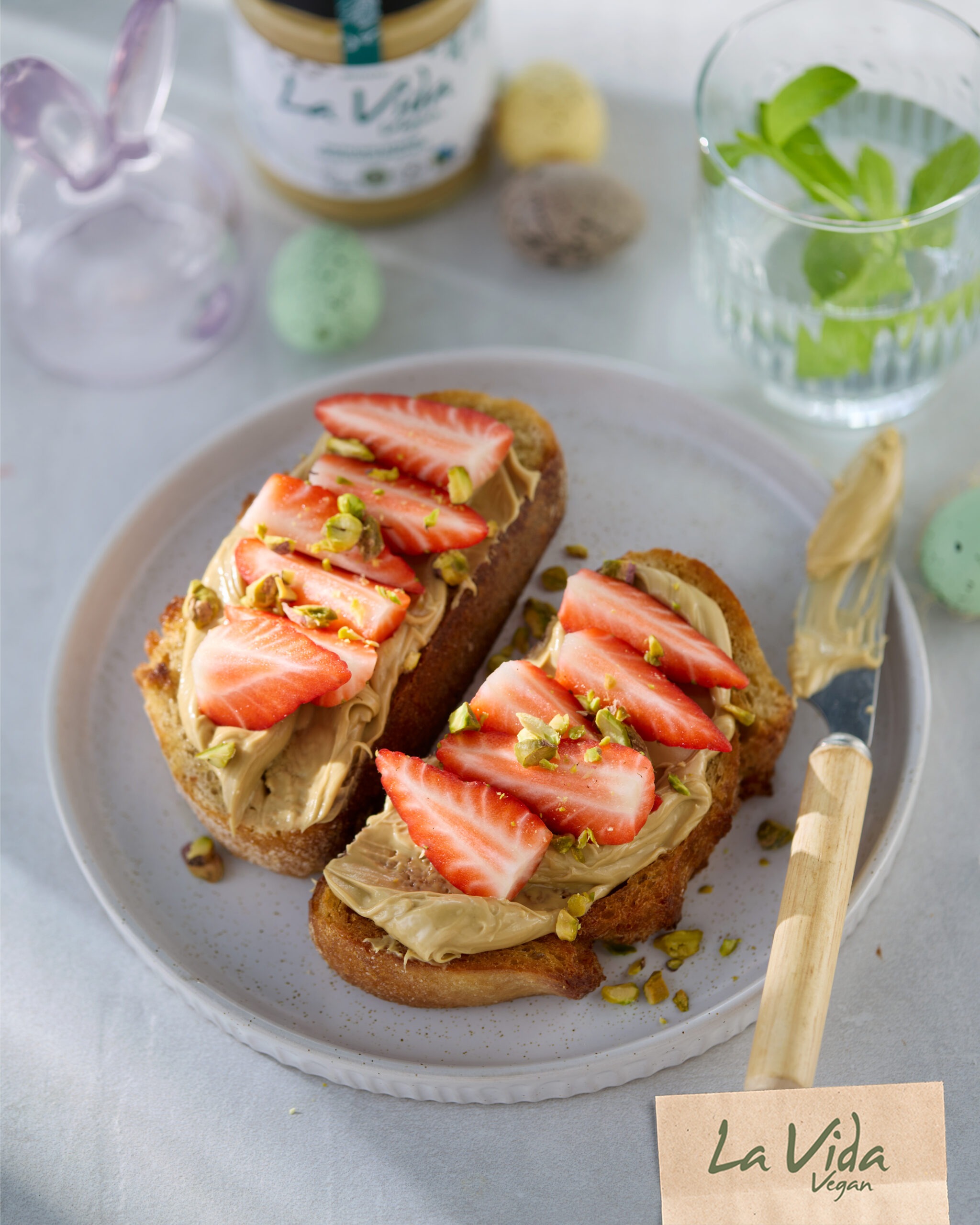 Golden toast with La Vida Vegan pistachio spread, topped with fresh strawberries and a few crushed nuts. Simple, quick and a nice idea to add to your Easter breakfast or brunch