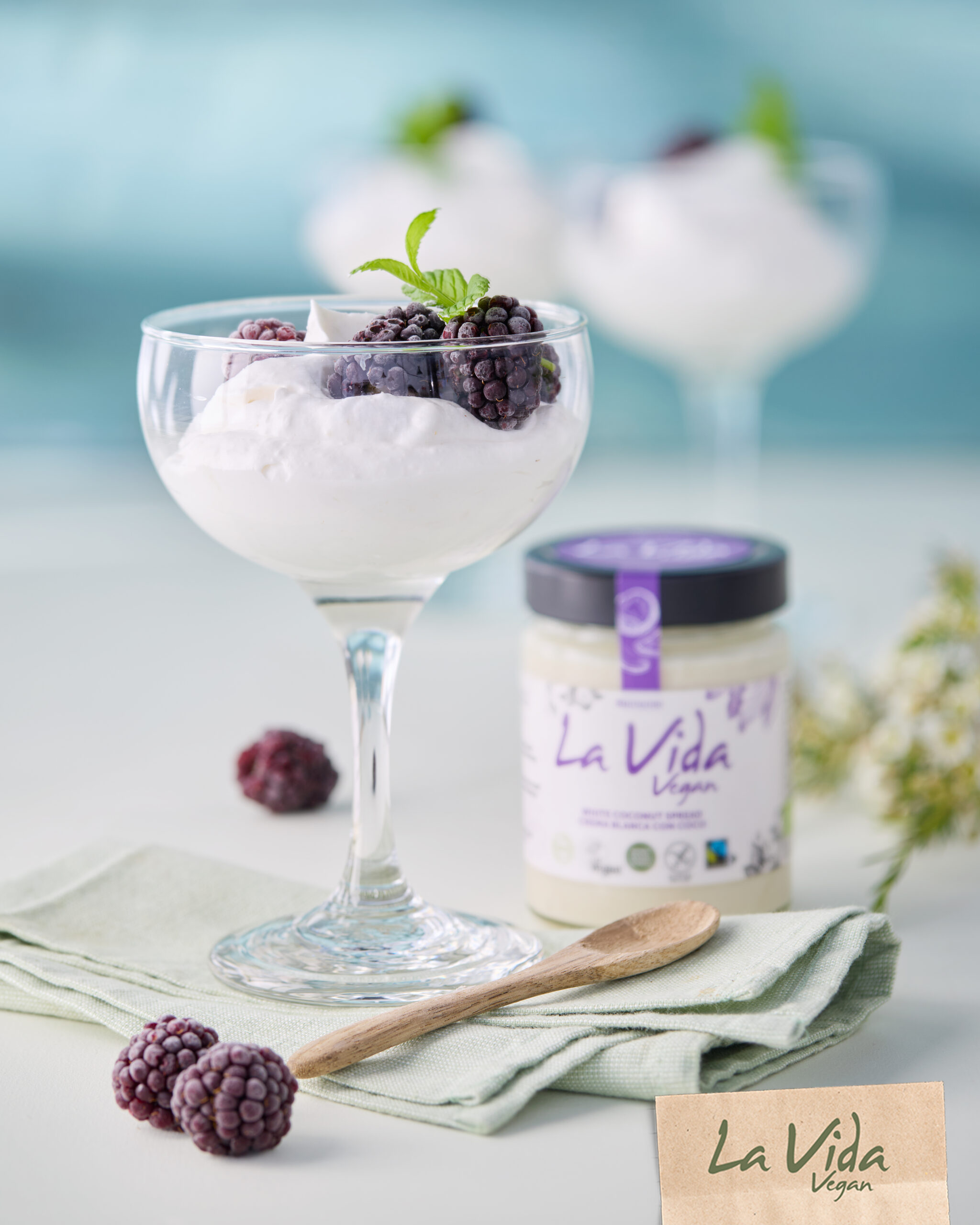 - Gently fold the La Vida Vegan white coconut spread into the whipped cream until it becomes a creamy mousse.